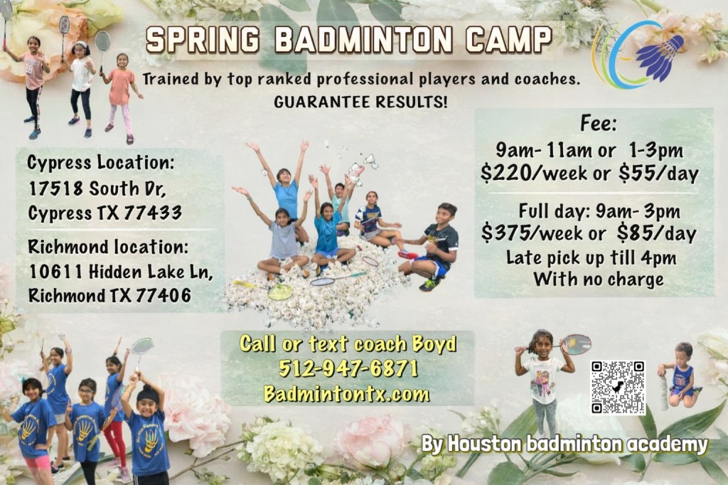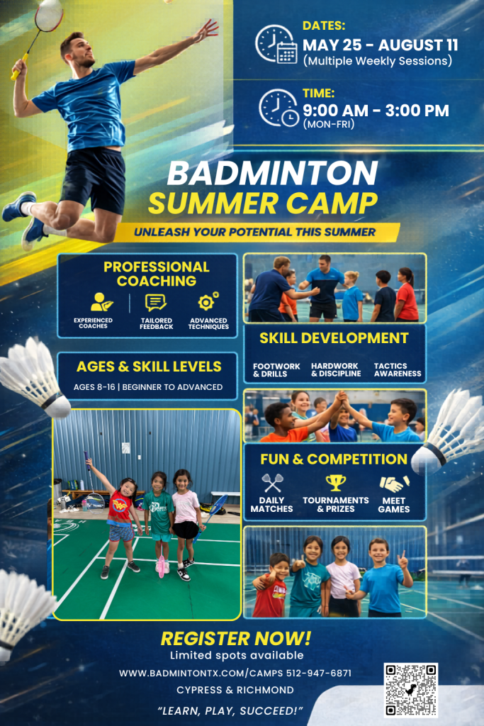 Houston Badminton Academy’s Seasonal Camps are designed to help your child stay engaged, improve their badminton skills, and build lasting friendships — all under the guidance of world-ranked coaches and players.