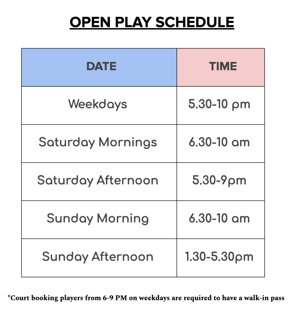 Training and court reservations take priority over open play. We will try our best to have courts available for open play, but in the case that courts are all reserved, unfortunately, open play players will not be given any priority